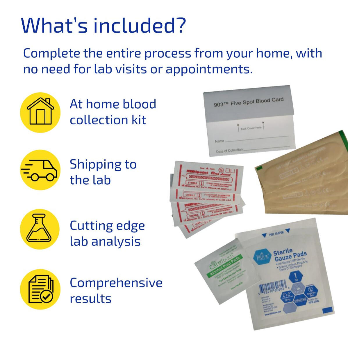 Realiza el test desde la comodidad de tu hogar, sin necesidad de visitas al laboratorio ni citas previas.Kit todo incluido
